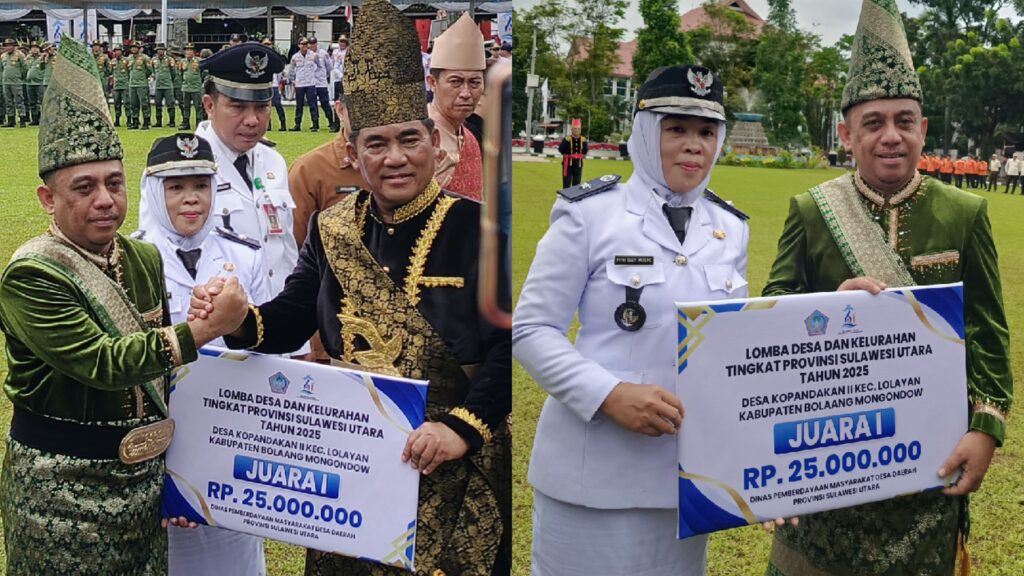 Penyerahan hadia berupa piagam pengharaan dan uang tunai sebesar Rp25 juta diserahkan oleh Gubernur Sulut, Mayjen TNI (Purn) Yulius Selvanus, SE, dan diterima langsung oleh Bupati Bolaang Mongondow, Yusra Alhabsyi, SE, M.Si, bersama Sangadi (Kepala Desa) Kopandakan Dua, Fitry Suly Antone, bertempat di lapangan kantor Gubernur Sulut, Selasa (23/09/2025)