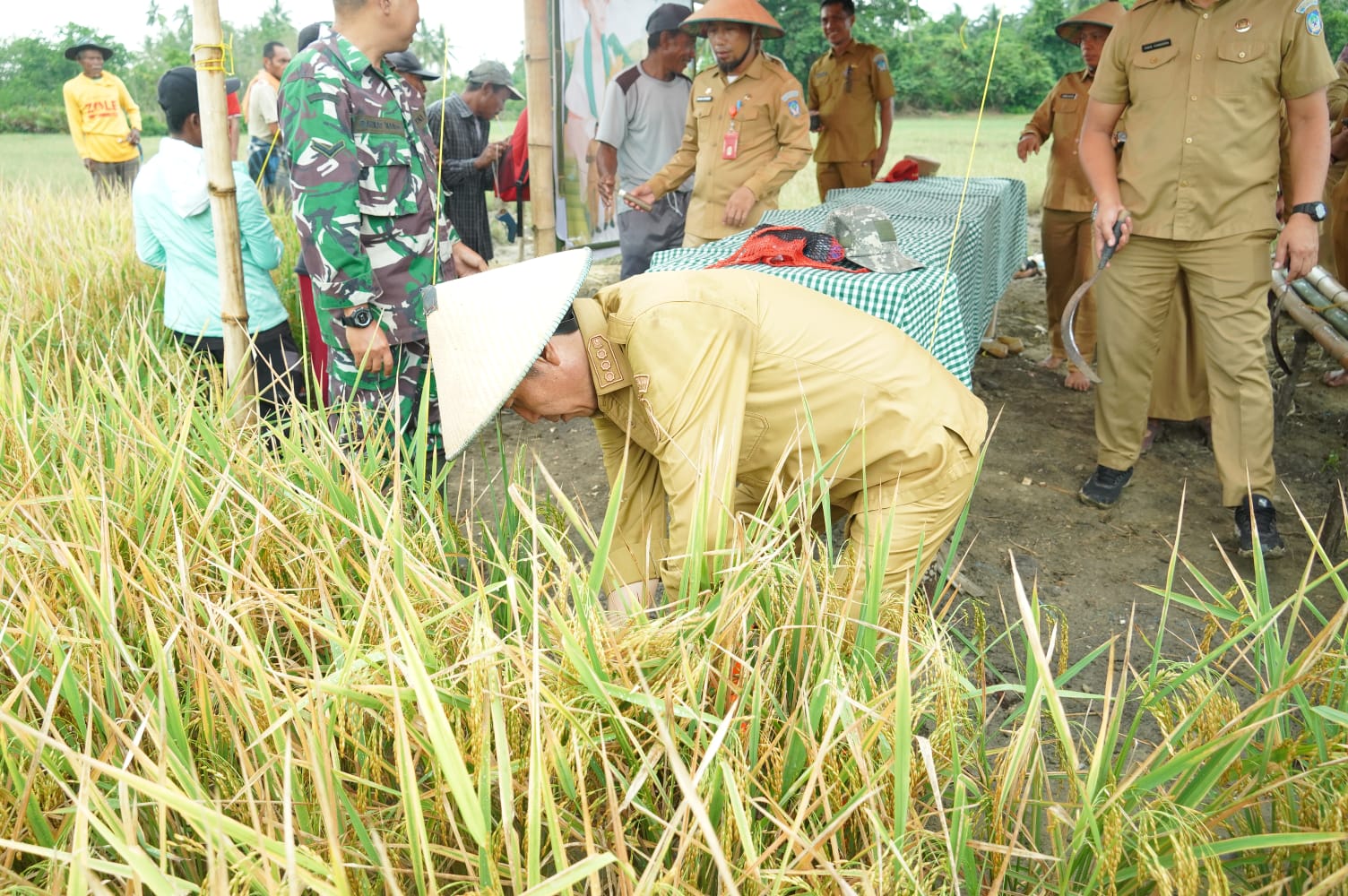 Dalam kesempatan tersebut, Bupati Iskandar meninjau secara langsung kegiatan panen padi sawah yang dilakukan oleh kelompok tani setempat.