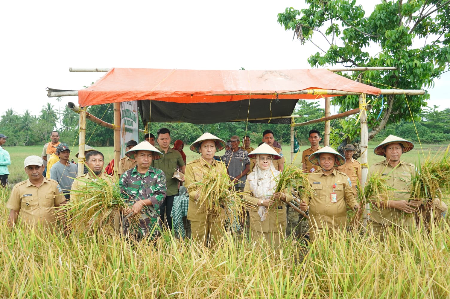 Dalam kesempatan tersebut, Bupati Iskandar meninjau secara langsung kegiatan panen padi sawah yang dilakukan oleh kelompok tani setempat.