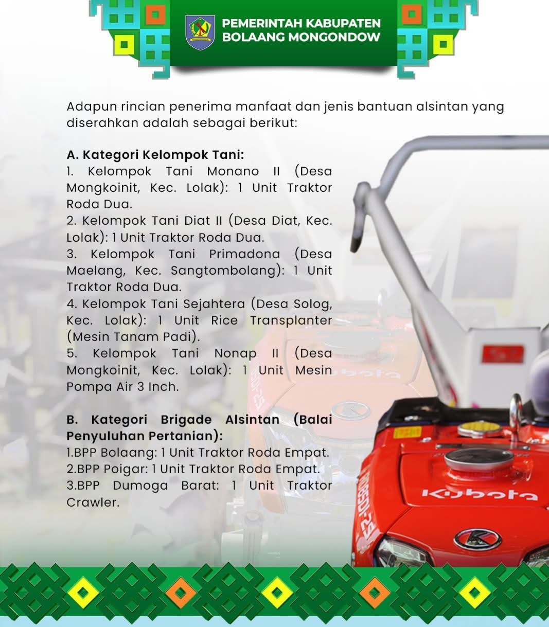 Adapun penerima bantuan alsintan Dinas Pertanian Kabupaten Bolaang Mongondow Tahun 2025 meliputi kelompok tani di Kecamatan Lolak dan Sangtombolang, serta Balai Penyuluhan Pertanian (BPP) Bolaang, Poigar, dan Dumoga Barat, dengan jenis bantuan berupa traktor roda dua, traktor roda empat, traktor crawler, rice transplanter, dan mesin pompa air.