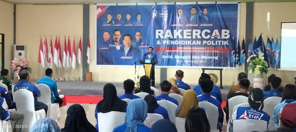 e-berita.com, Bolmut – Dewan Pimpinan Cabang (DPC) Partai Demokrat Kabupaten Bolaang Mongondow Utara (Bolmut) menggelar Rapat Kerja Cabang (Rakercab) yang dirangkaikan dengan kegiatan Pendidikan Politik, bertempat di Gedung Dharma Wanita Kawasan Objek Wisata Batu Pinagut, Desa Boroko Timur, Kecamatan Kaidipang, Senin (29/12/20225).