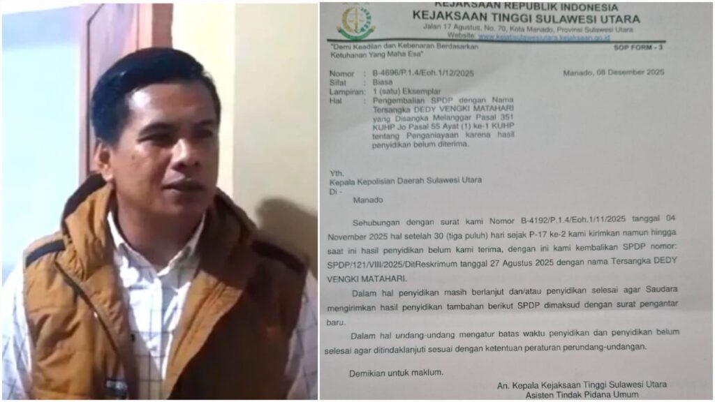 Pengembalian SPDP tersebut tertuang dalam surat Kejati Sulut bernomor B-4696/P.1.4/Eoh.1/12/2025. Dalam surat itu dijelaskan, lebih dari 30 hari sejak jaksa mengirimkan permintaan kelengkapan berkas perkara (P-17) kedua pada 4 November 2025, penyidik belum menyerahkan hasil penyidikan.