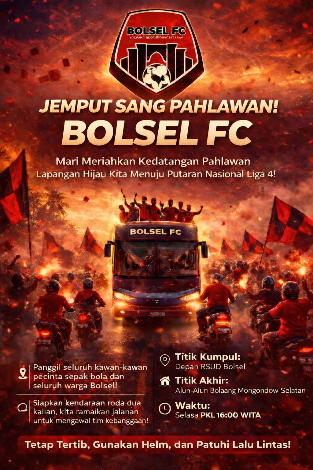 Berdasarkan pamflet yang beredar luas di berbagai platform media sosial, titik penyambutan dipusatkan di depan RSUD Bolsel, tepatnya pukul 16:00 Wita, Selasa (21/04/2026) sore ini.