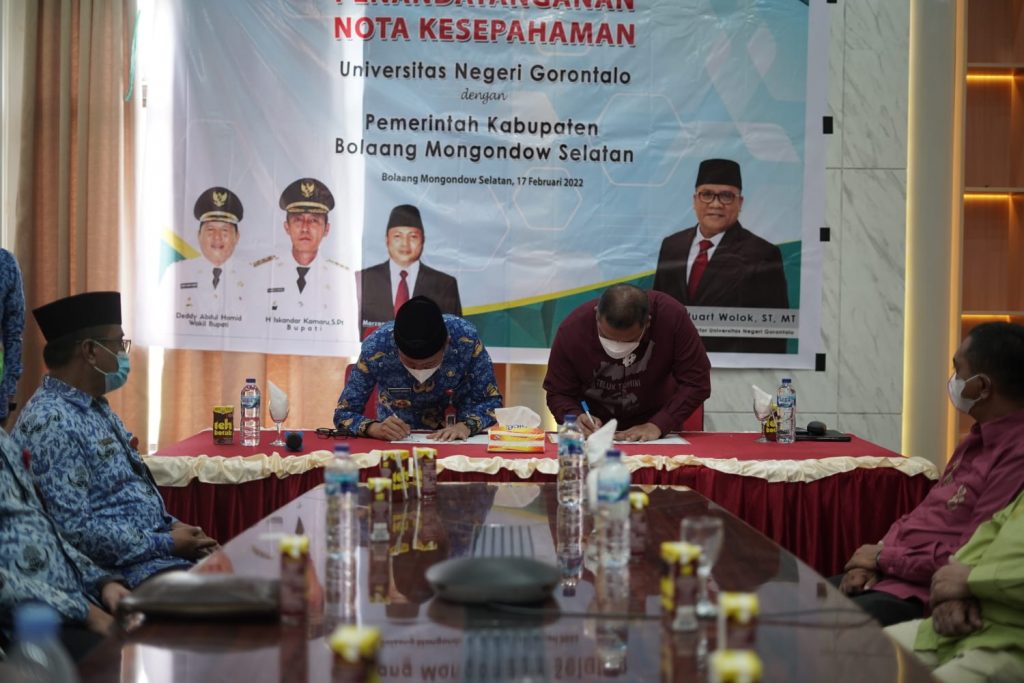 E-BERITA.COM, BOLSEL – Dalam pengembangan dan peningkatan Sumber Daya Manusia (SDM) di daerah, Bupati Bolsel Iskandar Kamaru dan Rektor Universitas Negeri Gorontalo (UNG) menandatangani Memorandum of Understanding (MoU).