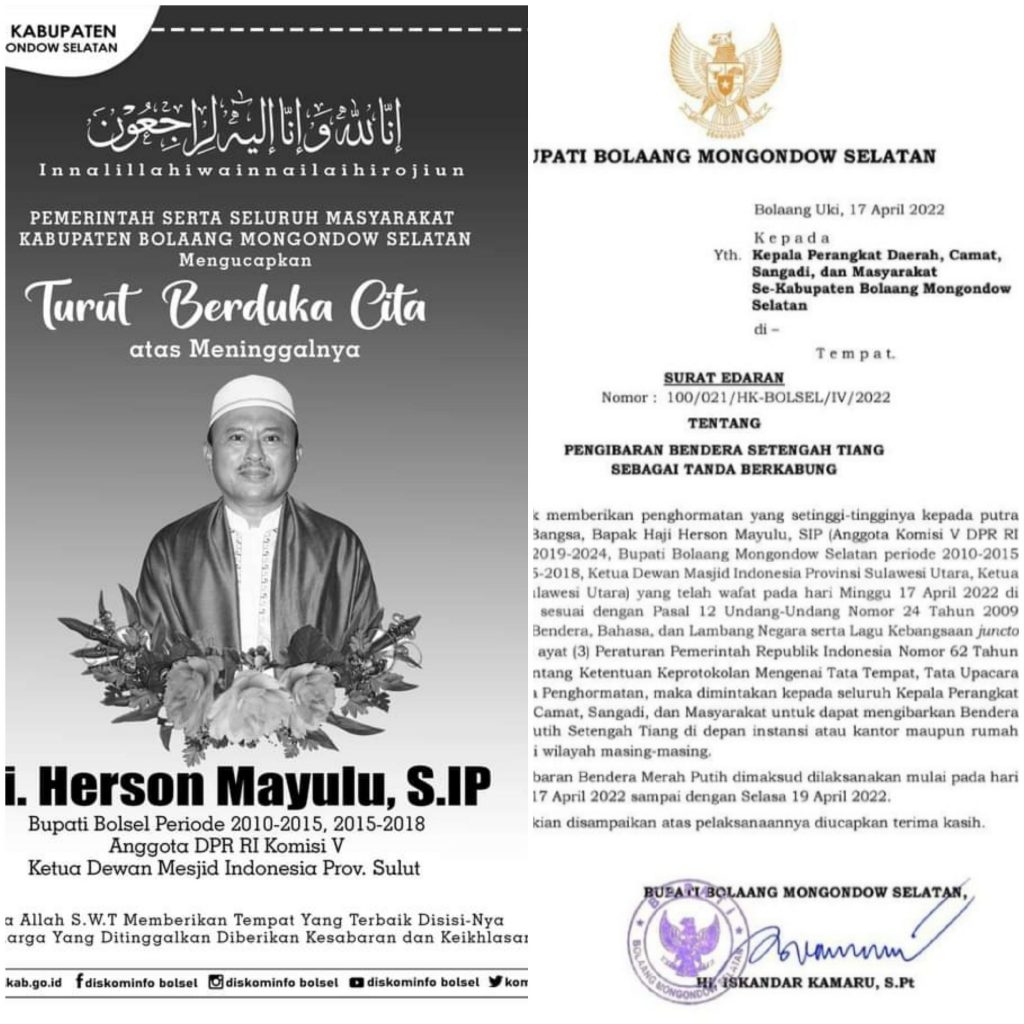 Instruksi ini pun dikeluarkan oleh Pemkab Bolsel melalui Surat Edaran (SE) nomor 100/021/HK-Bolsel/IV/2022 tentang pengibaran bendera setengah tiang sebagai tanda berkabung.