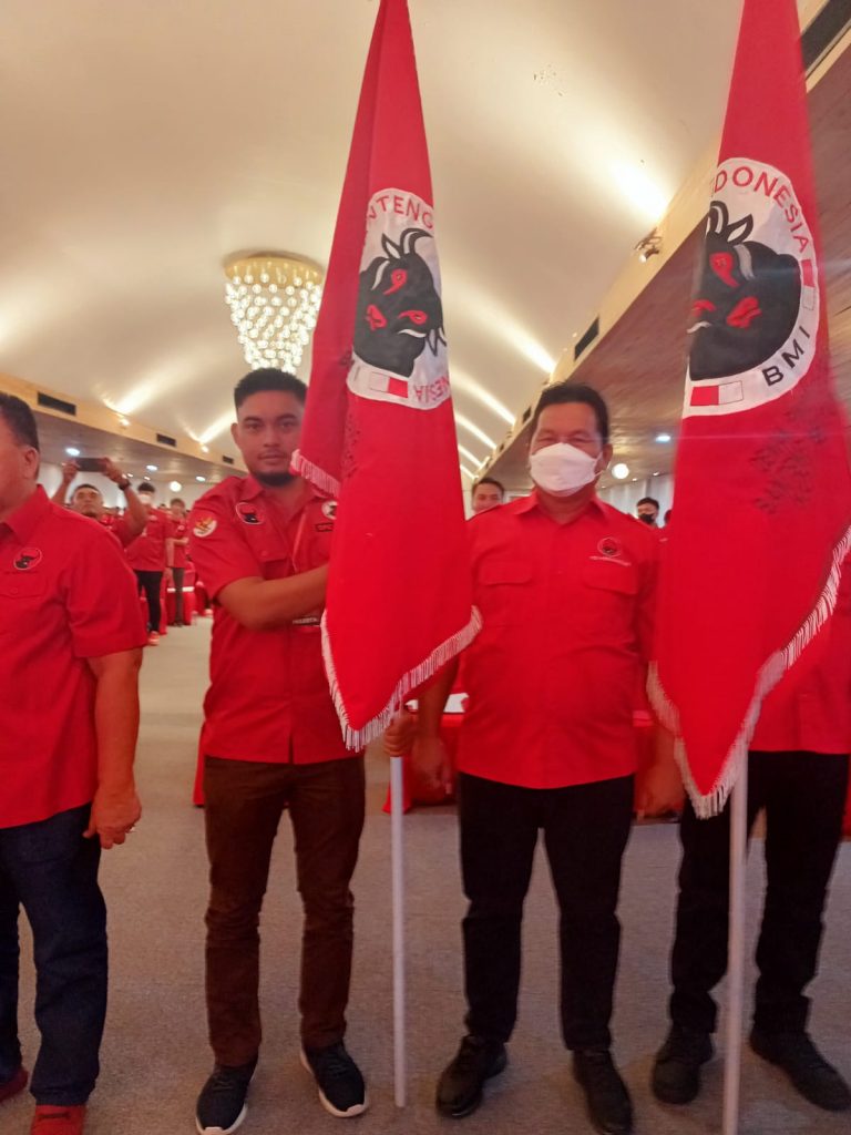 Mewakili Ketua DPC PDI Perjuangan Kabupaten Bolsel, Deddy Abdul Hamid menyerahkan PATAKA BMI ke DPC BMI Bolsel yang baru saja dilantik, dan diterima langsung oleh Ketua DPC BMI Bolsel, Reynaldi Pulumoduyo.