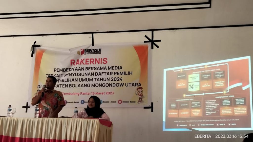 Hal itu disampaikan Arter Datunsolang saat menjadi pemateri pada Rapat kerja teknis (Rakernis) pemberitaan bersama media terkait penyusunan daftar pemilih pemilu 2024 yang di gelar oleh Bawaslu Bolmut di Gedung serba guna,Desa Tombulang Pantai, Kecamatan Pinogaluman,Kamis,16 Maret 2023.