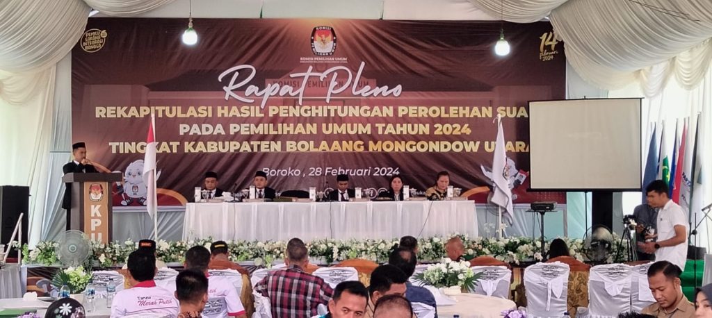 e-berita.com, Bolmut – Komisi Pemilihan Umum (KPU) Kabupaten Bolaang Mongondow Utara (Bolmut) menggelar rapat pleno rekapitulasi hasil penghitungan suara Pemilu 2024 di halaman Kantor KPU Bolmut, Rabu (28/2/2023).