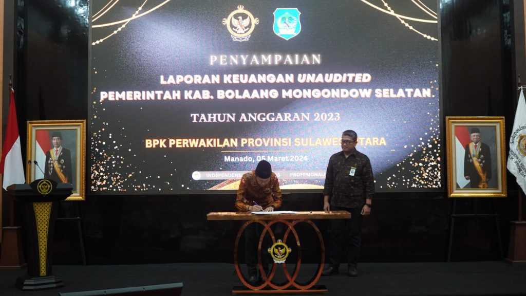 e-berita.com, Bolsel – Bupati Bolaang Mongondow Selatan (Bolsel), H Iskandar Kamaru S.Pt, M.Si secara langsung menyerahkan dokumen Laporan Keuangan Pemerintah Daerah (LKPD) Unaudited Tahun Anggaran 2023 ke Badan Pemeriksa Keuangan Republik Indonesia (BPK-RI) Perwakilan Sulut, Selasa, (05/03/2024).