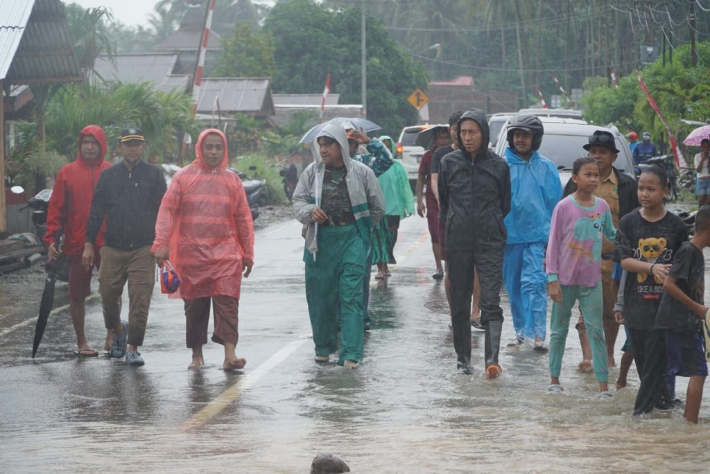 Terpantau, Bupati Iskandar berjalan kaki menyusuri jalan penghubung antar kecamatan di Desa Toluaya dan Desa Tolondadu meninjau titik-titik luapan air seraya menyapa warga.