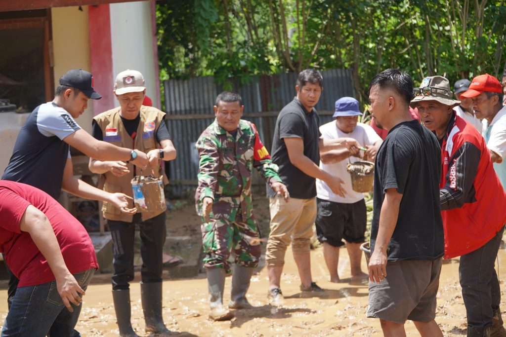 Terpantau, jajaran perangkat daerah dan personil TNI/Polri bergabung dengan warga setempat bahu membahu bekerja sama membersikan lumpur sisa banjir baik itu di desa Torosik, Adow, Tobayagan induk, Tobayagan Selatan, Dumagin B dan Dumagin A.