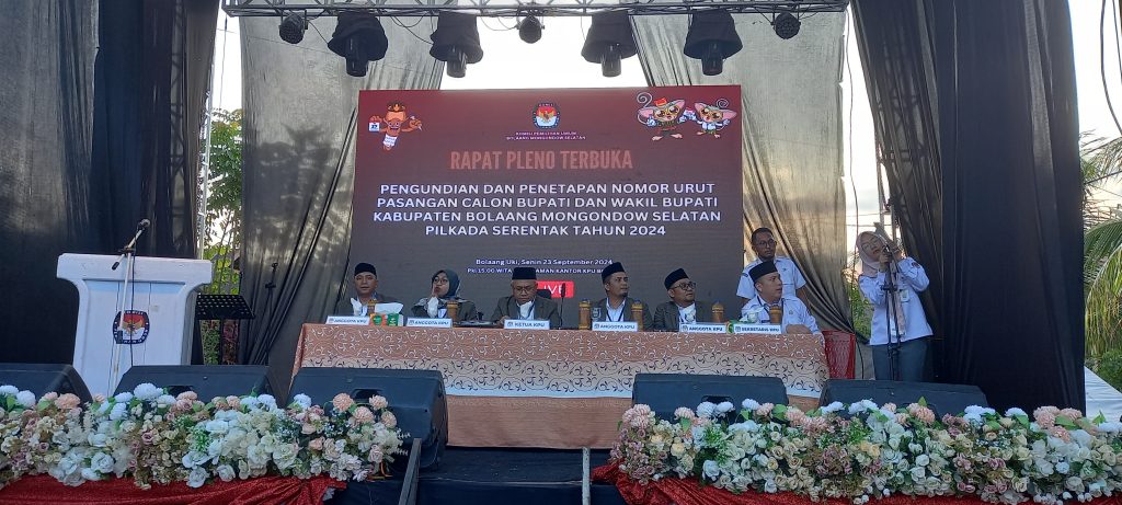 e-berita.com, Bolsel – Komisi Pemilihan Umum (KPU) Kabupaten Bolaang Mongondow Selatan (Bolsel) menggelar Rapat Pleno terbuka pengundian dan penetapan nomor urut pasangan calon Bupati dan Wakil Bupati di Pilkada Bolsel 2024.