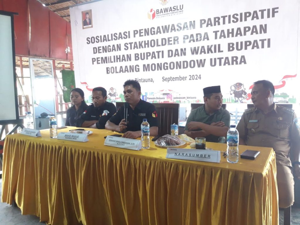 Ha itu disampaikan Ketua Panwaslu Kecamatan Bintauna,Iswandi Binolombangan saat membuka sosialisasi pengawasan partisipatif bersama Stakeholder yang digelar di Caffe Rahmat,Desa Bunia,Kecamatan Bintauna,Selasa (24/9/2024)