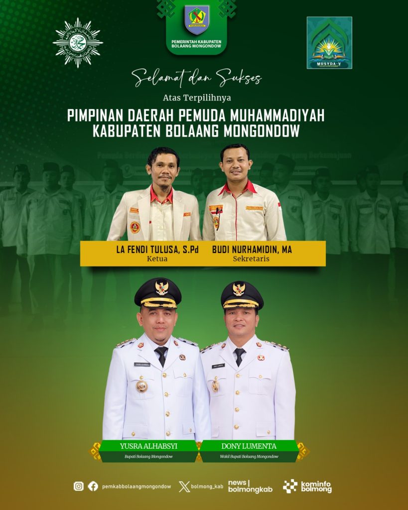 e-berita.com, Bolmong – Bupati dan Wakil Bupagi Bolaang Mongondow (Bolmong), Yusra Alhabsyi – Dony Lumenta menyampaikan ucapan selamat atas terpilihnya La Fendi Tulusa sebagai Ketua dan Budi Nurhamidin sebagai Sekretaris Pimpinan Daerah Pemuda Muhammadiyah (PDPM) Kabupaten Bolmong untuk periode 2025-2030.